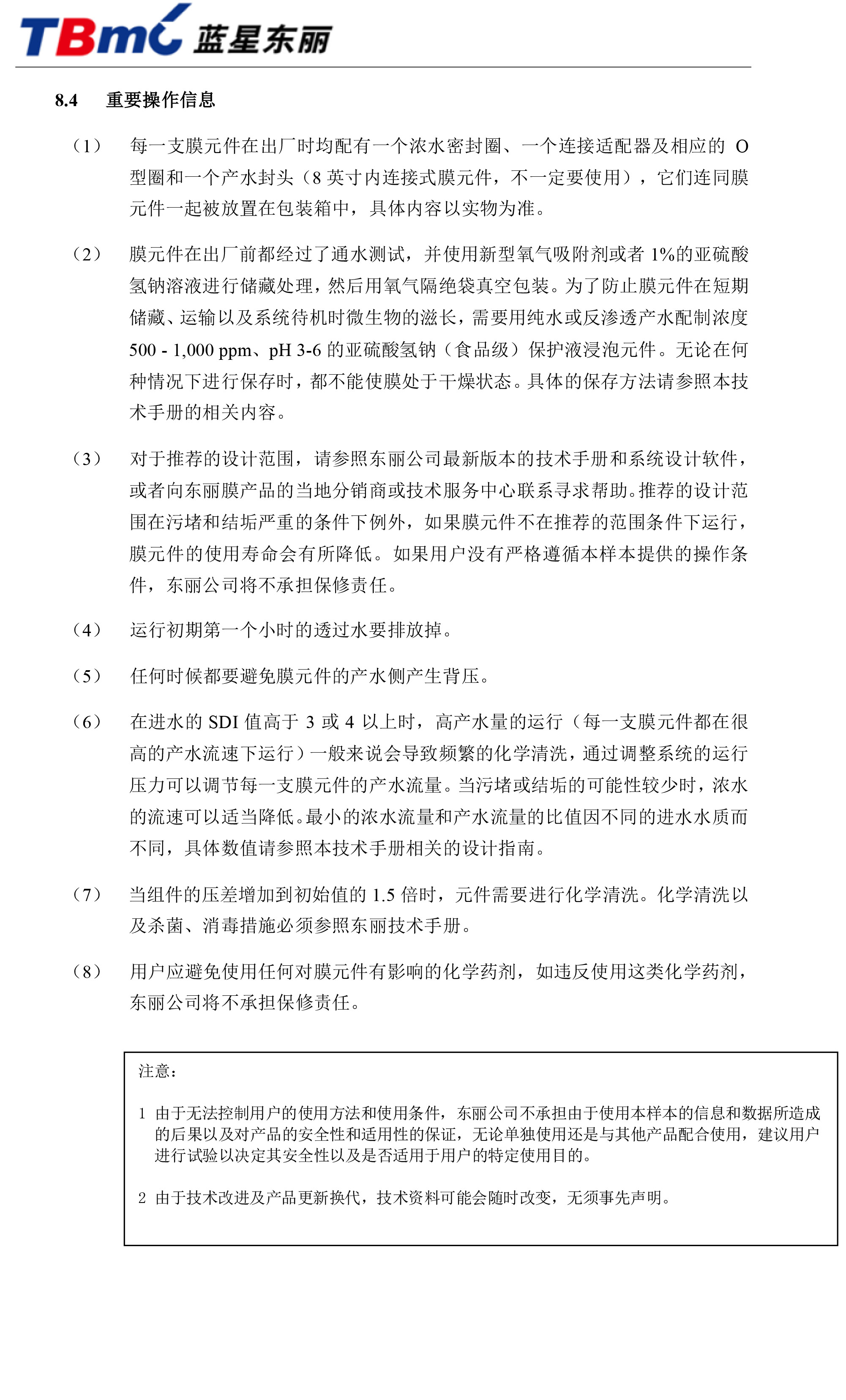TM720D-370 是采用最新的材料及生產(chǎn)技術(shù)的一款高脫鹽率、高產(chǎn)水量、耐化學(xué)清洗的膜元 件。有效膜面積為 370 平方英尺,給水流道 34mil。適合于含鹽量 10000ppm 以下的苦咸水 淡化,以及微污染地表水的脫鹽、冷卻循環(huán)排污水的回用等各種應(yīng)用領(lǐng)域。TM720D-370 具 有最寬泛的清洗 pH 值范圍(pH1~13),可以快速有效的解決膜元件的污染問題;反滲透膜 片能夠承受一定范圍內(nèi),由于操作失誤等原因造成的輕微余氯泄露事故,提高了系統(tǒng)的安全 性。